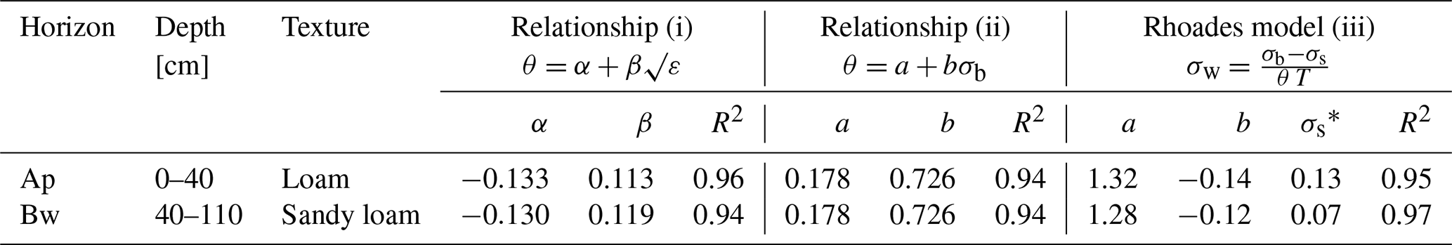 Rhoades θ–σb–σw model: A θ–σb–σw Rhoades et al. (1976) model parameters a, b and σs were estimated from laboratory dataset separately for the two horizons.