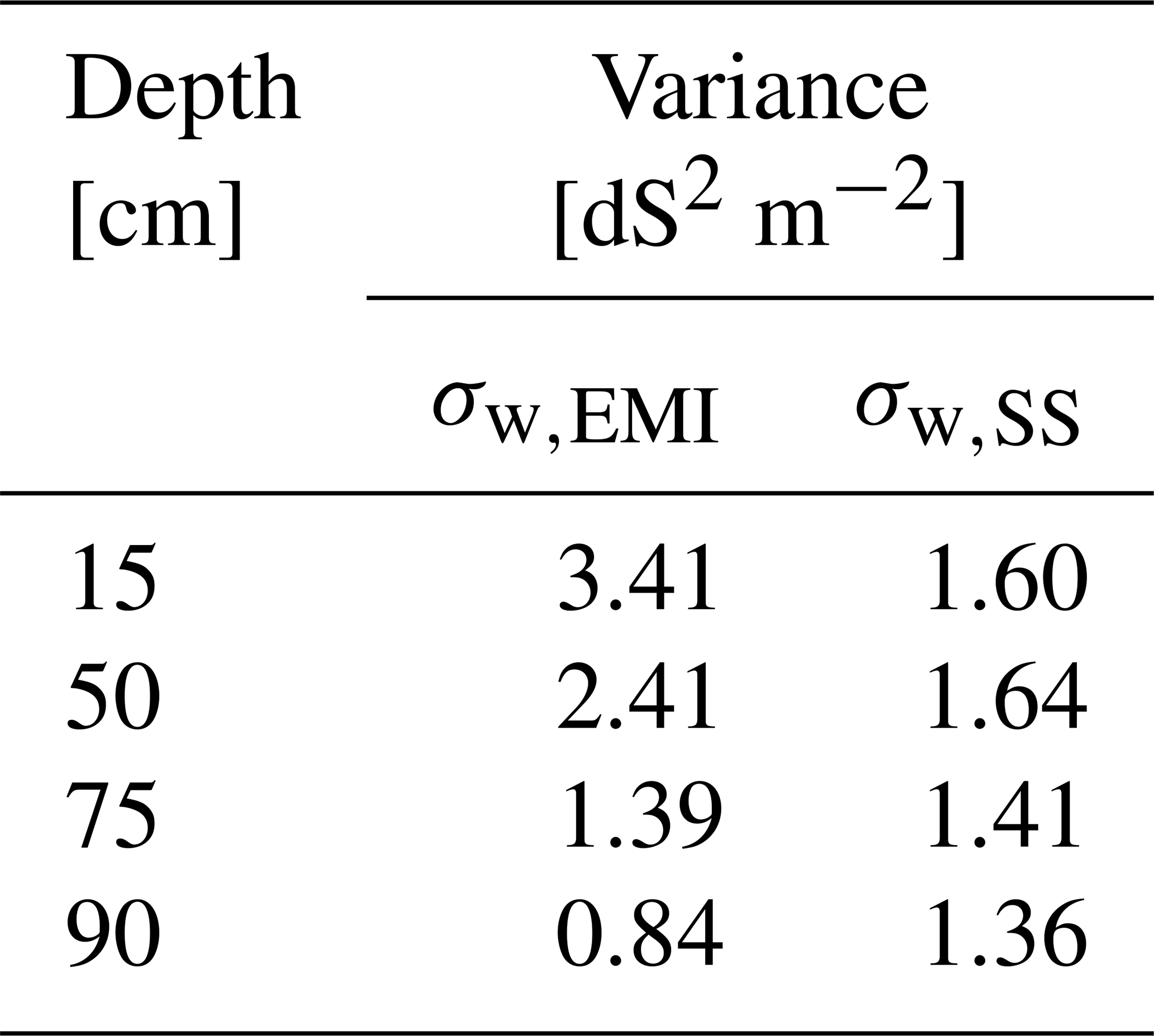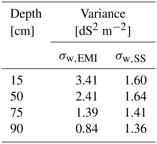 As suggested by Robinet et al. (2018) who analysed the reasons behind discrepancies in σb detected by sensors operating at different observation volumes – similar to our case – the weak correlation between EMI and soil sampling measurements for a shallow sensing coil configuration and the forward-calculated ECa can be attributed to several factors. Firstly, significant variations in σb near the soil surface may not be effectively captured by local soil sampling. Secondly, the uneven and irregular nature of the soil surface can significantly impact EMI measurements. Variations in elevation and rough terrain make it difficult for the operator to keep the instrument at a constant height above the ground. Since EMI measurements are highly sensitive to the distance between the sensor and the soil, any fluctuations in height can introduce inconsistencies in the data, potentially affecting the accuracy and reliability of the results. Thirdly, σb measurements are influenced by the maize root system, which is denser in the shallower soil layer, further impacting the readings. These factors contribute to the relatively high variance observed at 15 cm in EMI measurements (σw,EMI), which decreases with depth (see Table 2). By contrast, the same table shows that the variance σw,SS remains roughly constant, with a slight decrease toward depth.