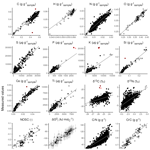 Figure 2Measured versus fitted and predicted values for all target variables. For , standard errors of prediction estimated by the auxiliary model (Sect. S2) are shown as error bars. Diamond-shaped points with red borders are outliers (discussed in the text).