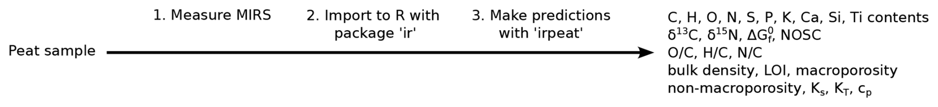 Our aim was to develop transmission-MIRS prediction models for peat with the quality standards of state of the art prediction models for mineral soils. We have developed models for element contents (C, N, H, O, P, S, K, Ti), element ratios (, , ), isotope values (δ13C, δ15N), physical properties (bulk density, macroporosity, non-macroporosity, hydraulic conductivity, specific heat capacity, dry thermal conductivity), Gibbs free energy of formation (), and nominal oxidation state of carbon (NOSC) of bog peat with data from the pmird database, one of the largest spectral databases available for peat soils. The models have predictive accuracies comparable to or better than existing models for peat, while covering a more diverse range of peat spectral chemistry. All models are available via the R packages irpeat and irpeatmodels. irpeat automatically propagates prediction errors and flags predictions where spectra are outside the prediction domain of the models.