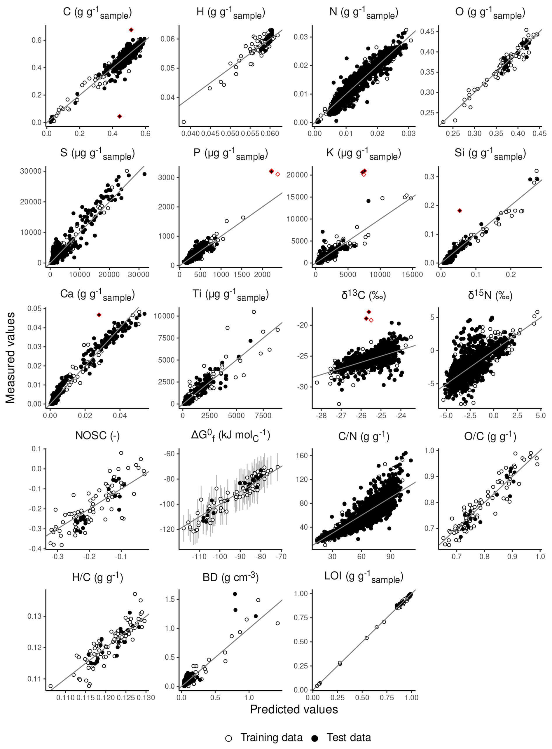 To this end, we computed spectral prediction models for element contents (C, H, N, O, P, S, K, Ca, Si, Ti), element ratios (, , ), isotope values (δ13C, δ15N), physical properties (bulk density (BD), loss on ignition (LOI) macroporosity, non-macroporosity, volume fraction of solids, saturated hydraulic conductivity (Ks), specific heat capacity (cp), dry thermal conductivity (KT)), standard Gibbs free energy of formation (), and nominal oxidation state of C (NOSC) (Masiello et al., 2008). To our knowledge, our study is the first test to compute prediction models for some of these variables (O, K, Ca, Si, Ti contents, , , δ13C, δ15N, , NOSC, LOI). The models were computed and validated with data from one of the largest open accessible peat spectral libraries (Teickner et al., 2025a) which makes them representative for more diverse peat samples than most existing models that focus on peat. While some of our models may only generate approximate predictions (especially δ13C and δ15N), many have prediction errors small enough to be useful in diverse applications.