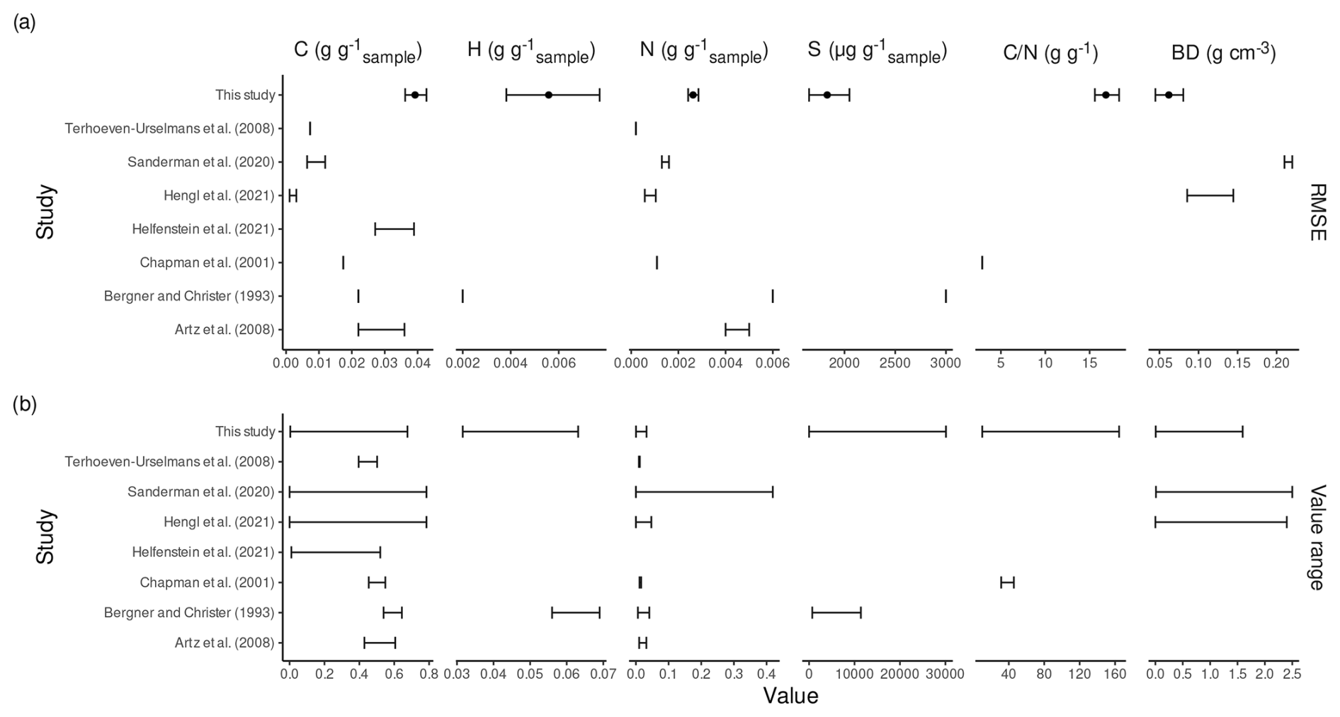 Figure 3RMSE for test data from the best models compared to RMSE for test data from other studies (a) and ranges of target variable values in the training data for the models (b). In (a), points are average values and error bars 95 % confidence intervals for individual models (our models) or the ranges of average RMSE for different strata of the data, where different analyses were performed. When studies report only one point estimate, this point estimate is shown was vertical tic. In (b), error bars are ranges for target variable values in the training data.