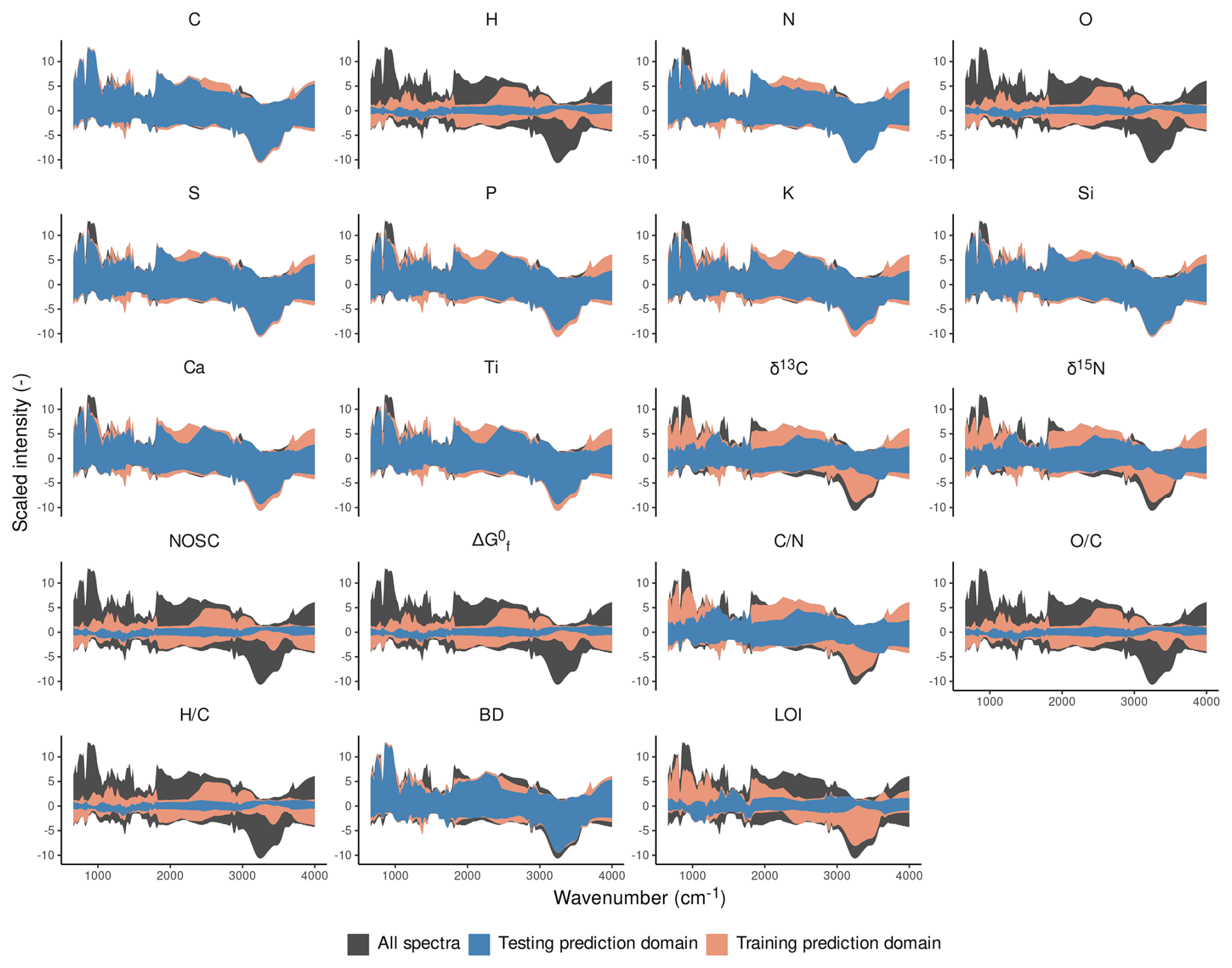 Figure 4Prediction domains of the best model for each target variable. The training and testing prediction domains are created from the maximum and minimum intensity values at each wavenumber of the preprocessed spectra across the training or test data. The shaded region “All spectra” is formed in the same way, but with all data that were used for model development. For this plot, to allow easier comparison of prediction domains between target variables, the spectra were all preprocessed and scaled in the same way (zero derivative spectra, scaling of intensities as for C).