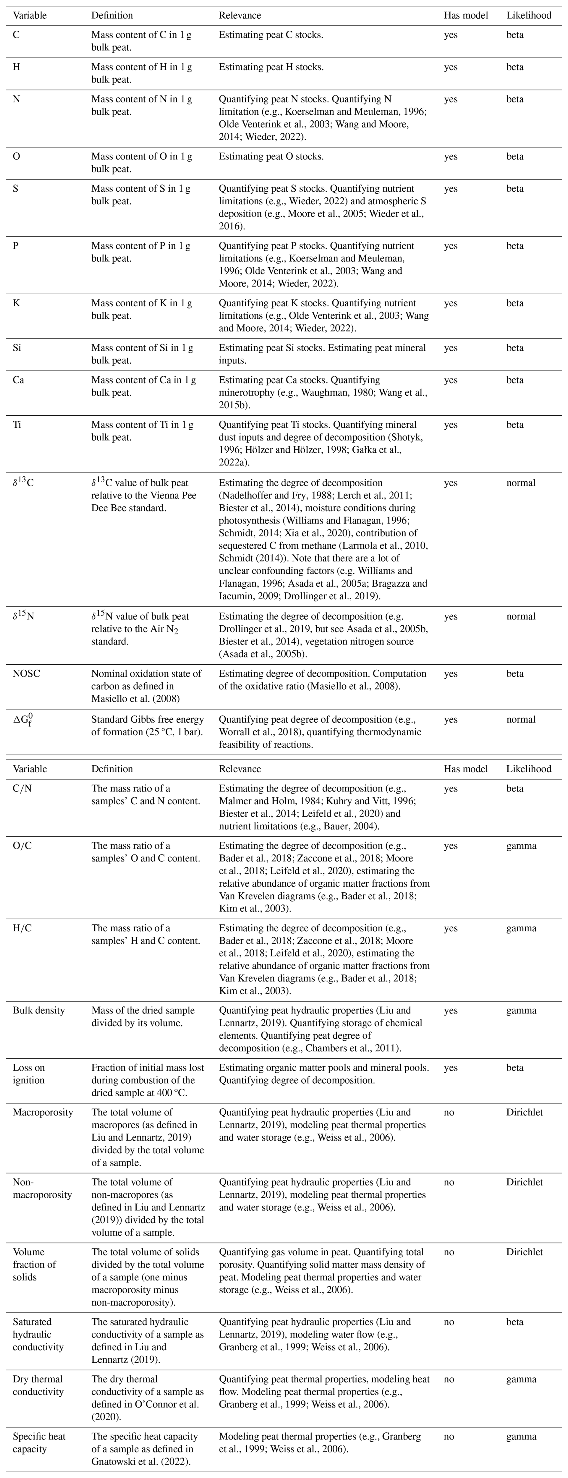 (e.g., Koerselman and Meuleman, 1996; Olde Venterink et al., 2003; Wang and Moore, 2014; Wieder, 2022)(e.g., Wieder, 2022)(e.g., Moore et al., 2005; Wieder et al., 2016)(e.g., Koerselman and Meuleman, 1996; Olde Venterink et al., 2003; Wang and Moore, 2014; Wieder, 2022)(e.g., Olde Venterink et al., 2003; Wang and Moore, 2014; Wieder, 2022)(e.g., Waughman, 1980; Wang et al., 2015b)(Shotyk, 1996; Hölzer and Hölzer, 1998; Gałka et al., 2022a)(Nadelhoffer and Fry, 1988; Lerch et al., 2011; Biester et al., 2014)(Williams and Flanagan, 1996; Schmidt, 2014; Xia et al., 2020)(Larmola et al., 2010, )Schmidt (2014)(e.g. Williams and Flanagan, 1996; Asada et al., 2005a; Bragazza and Iacumin, 2009; Drollinger et al., 2019)Drollinger et al., 2019Asada et al., 2005bBiester et al., 2014(Asada et al., 2005b)Masiello et al. (2008)(Masiello et al., 2008)(e.g., Worrall et al., 2018)(e.g., Malmer and Holm, 1984; Kuhry and Vitt, 1996; Biester et al., 2014; Leifeld et al., 2020)(e.g., Bauer, 2004)(e.g., Bader et al., 2018; Zaccone et al., 2018; Moore et al., 2018; Leifeld et al., 2020)Bader et al., 2018; Kim et al., 2003(e.g., Bader et al., 2018; Zaccone et al., 2018; Moore et al., 2018; Leifeld et al., 2020)Bader et al., 2018; Kim et al., 2003(Liu and Lennartz, 2019)(e.g., Chambers et al., 2011)Liu and Lennartz, 2019(Liu and Lennartz, 2019)(e.g., Weiss et al., 2006)Liu and Lennartz (2019)(Liu and Lennartz, 2019)(e.g., Weiss et al., 2006)(e.g., Weiss et al., 2006)Liu and Lennartz (2019)(Liu and Lennartz, 2019)(e.g., Granberg et al., 1999; Weiss et al., 2006)O'Connor et al. (2020)(e.g., Granberg et al., 1999; Weiss et al., 2006)Gnatowski et al. (2022)(e.g., Granberg et al., 1999; Weiss et al., 2006)Table 1Overview on the peat properties for which we computed prediction models. “Has model” indicates whether we computed a spectral prediction model for the target variable (“yes”) or a pedotransfer function which uses bulk density or N content to predict the variable (“no”). “Likelihood” is the likelihood used in the prediction model for each target variable (see Sect. 2.4).