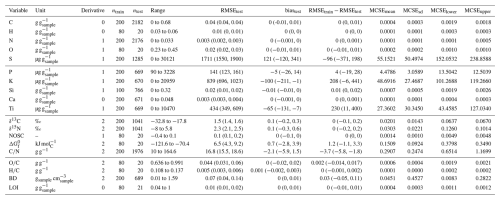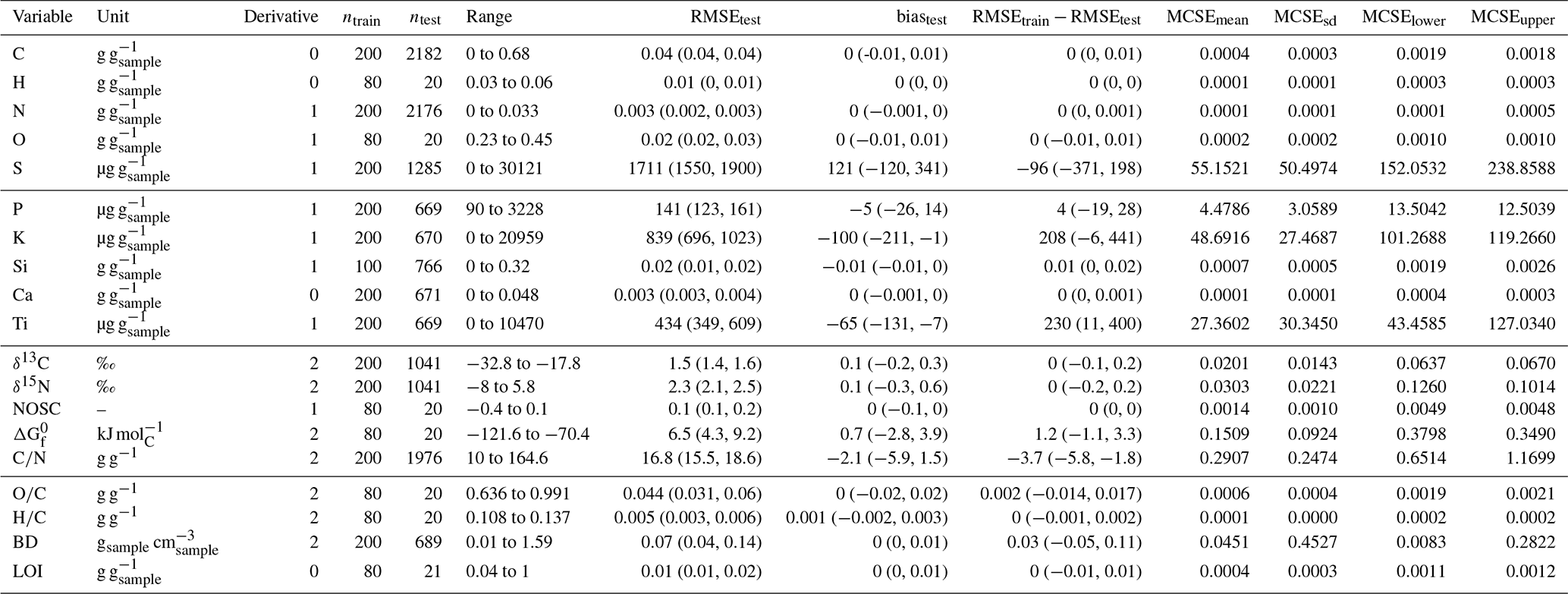 Table 2Overview on the predictive properties of the best models for each target variable. “Unit” is the measurement unit for all numeric variables. “Derivative” indicates which derivative of the spectra was used in the model. “ntrain” and “ntest” are training and testing sample sizes. “RMSEtest” is the root mean square error computed for the test data. “biastest” is the average difference between predictions and measurements. “RMSEtrain−RMSEtest” is the difference between the training RMSE and the testing RMSE (RMSEtest). “MCSEmean”, “MCSEsd”, “MCSElower”, and “MCSEupper” are maximum estimated Monte Carlo standard errors for the average, standard deviation, lower, and upper 95 % prediction interval for predicted values across the training and testing data. “BD” is bulk density and “LOI” is loss on ignition.