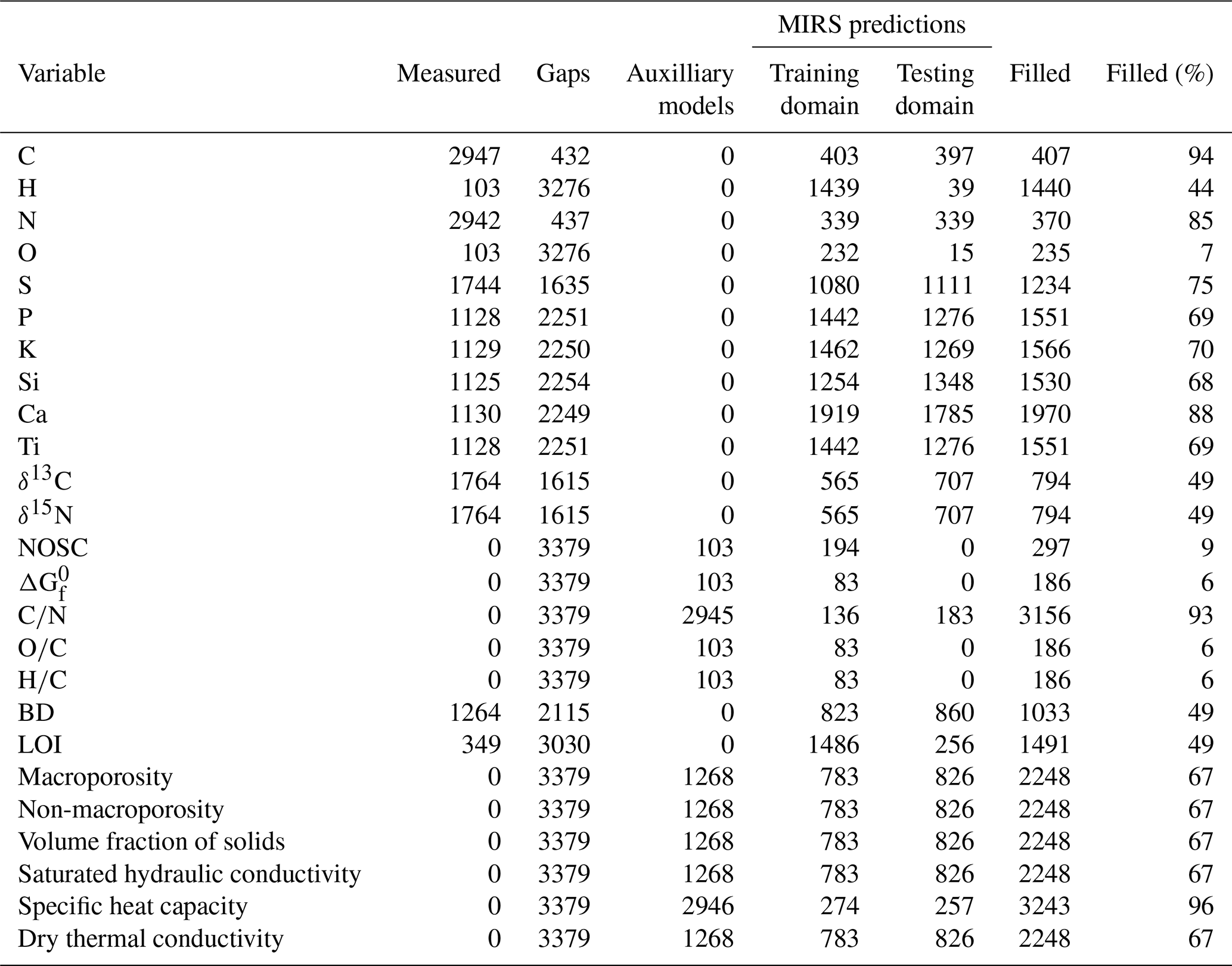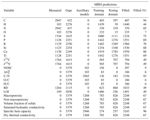 Table 3Summary of gap filling the pmird database. For each variable, the table shows the number of measured values (no gap filling needed) (“Measured”), the number of gaps (“Gaps”), the number of gaps that can be filled with the pedotransfer functions (with bulk density or N measurements), with the auxiliary model for (with element contents), or with formulas for element ratios and NOSC (with element contents) (“Auxiliary models”), the number of gaps that can be filled with MIRS predictions, where spectra are in the training or in the testing prediction domain (“Training domain” and “Testing domain”; some spectra are in both prediction domains and then are counted twice), the number of gaps that could be filled in total (“Filled”), and the fraction of gaps that could be filled (“Filled (%)”). In total, there were 3379 samples with spectra for each target variable.