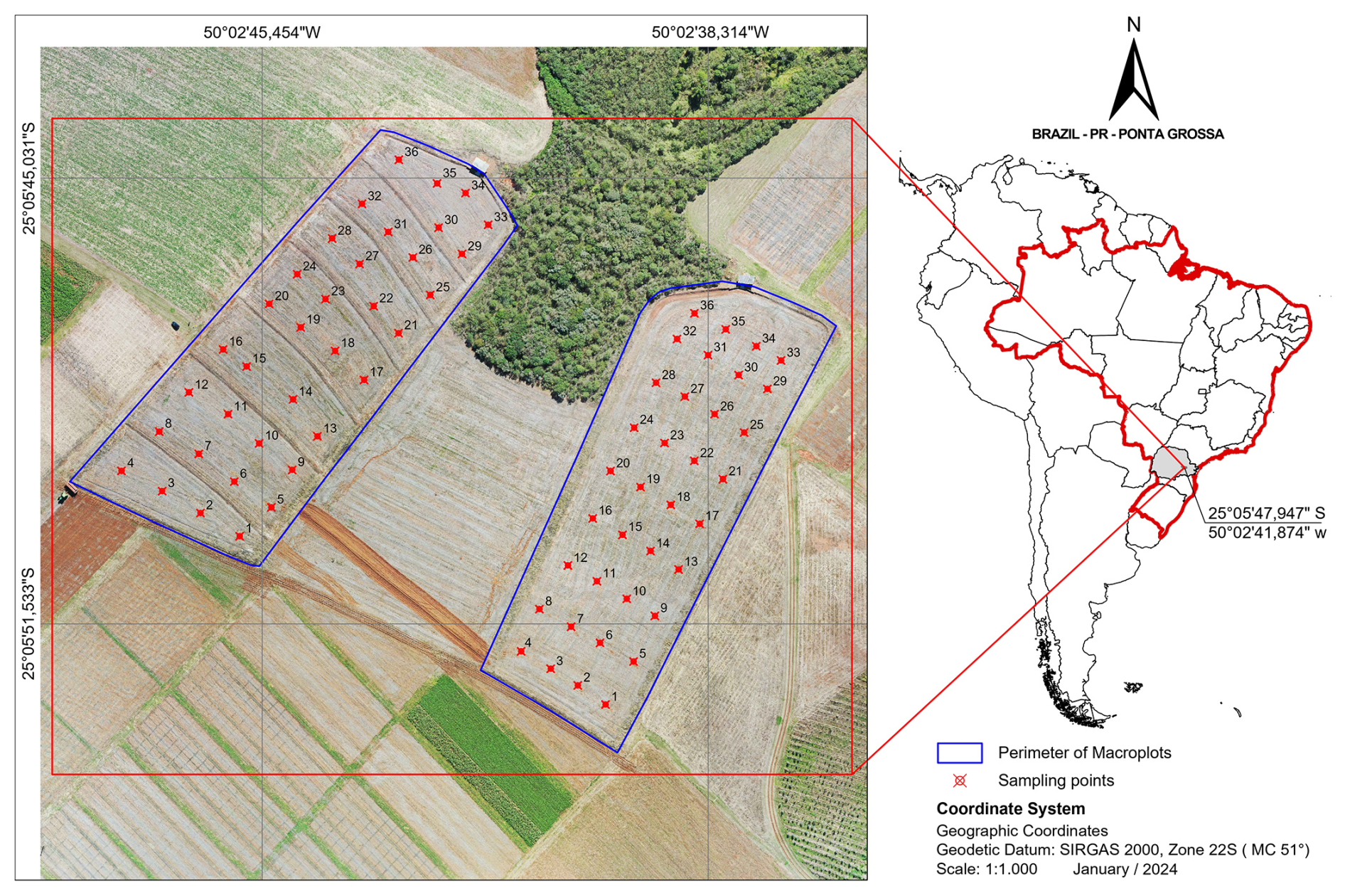 In the 1980s, conventional tillage predominated in the study area for grain cultivation, employing mechanical conservation practices (terraces) to control erosion and conserve water. In the early 1990s, the area transitioned to no-till with occasional subsoiling, and the terraces were removed. In 2018, this experiment was initiated with the surface application of 2.3 t ha−1 of limestone, followed by soil subsoiling to a depth of 0.3 m. Finally, the experiment was set up with two mega-plots, both maintained under no-till: (1) no-till (NT) and (2) no-till with terraces (NT+T). Within each mega-plot, a regular grid of 36 georeferenced sampling points (n=36) was established for soil sampling. These points represent spatial observations within each management condition rather than independent experimental replicates. Soil sampling was carried out between May and June in the years 2020, 2021, and 2022.