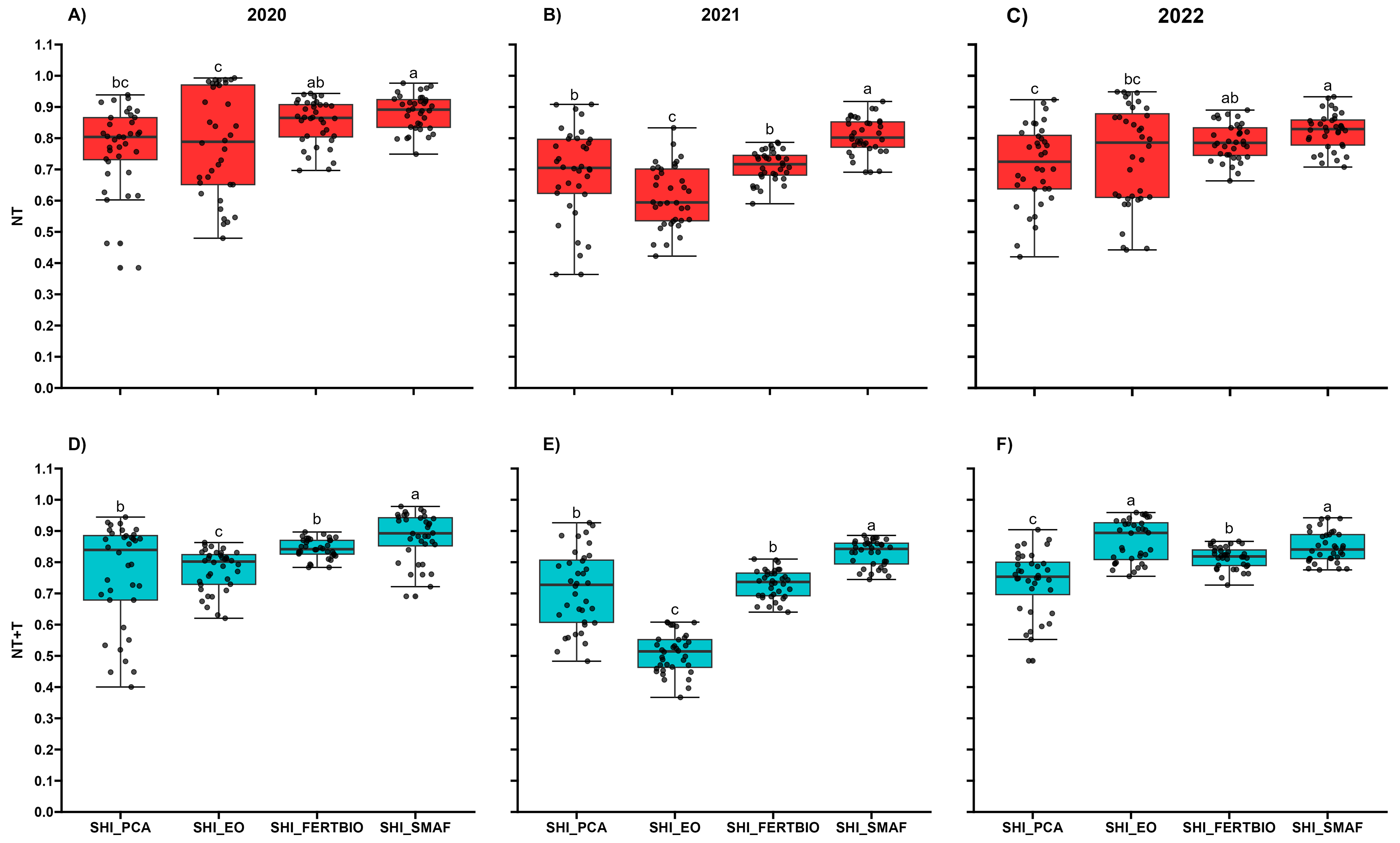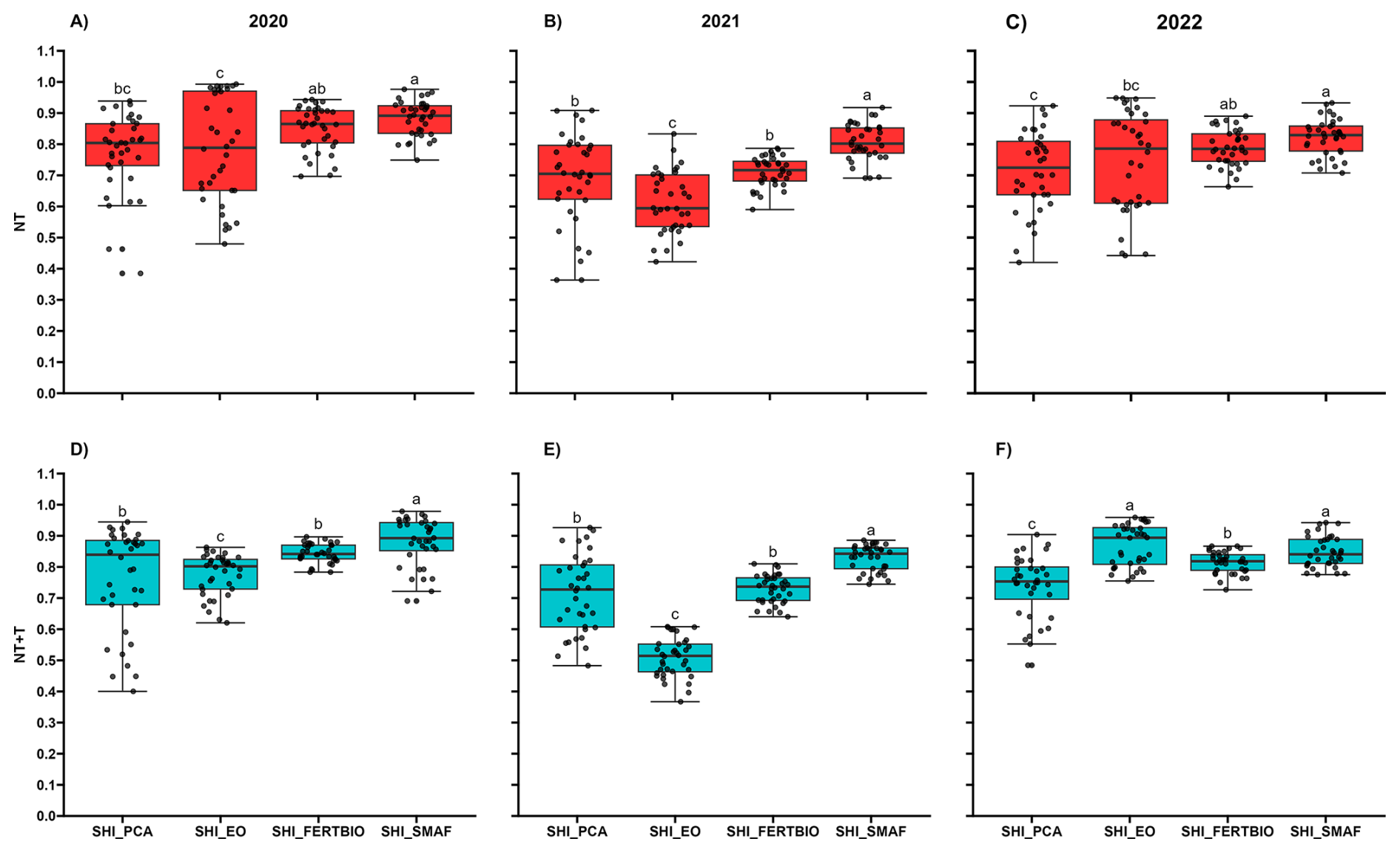 Figure 3SMAF consistently showed the highest scores in soil health assessment over the three years of evaluation. Box plots of soil health indices – SHI_PCA, SHI_EO, SHI_FERTBIO, and SHI_SMAF – measured in 2020 (a, d), 2021 (b, e), and 2022 (c, f) for mega-plots managed under no-till (NT) (a–c) and no-till with terraces (NT+T) (d–f). Different letters indicate statistically significant differences among SHI values within the same year and treatment, according to the Kruskal–Wallis test followed by Dunn test (p<0.05).