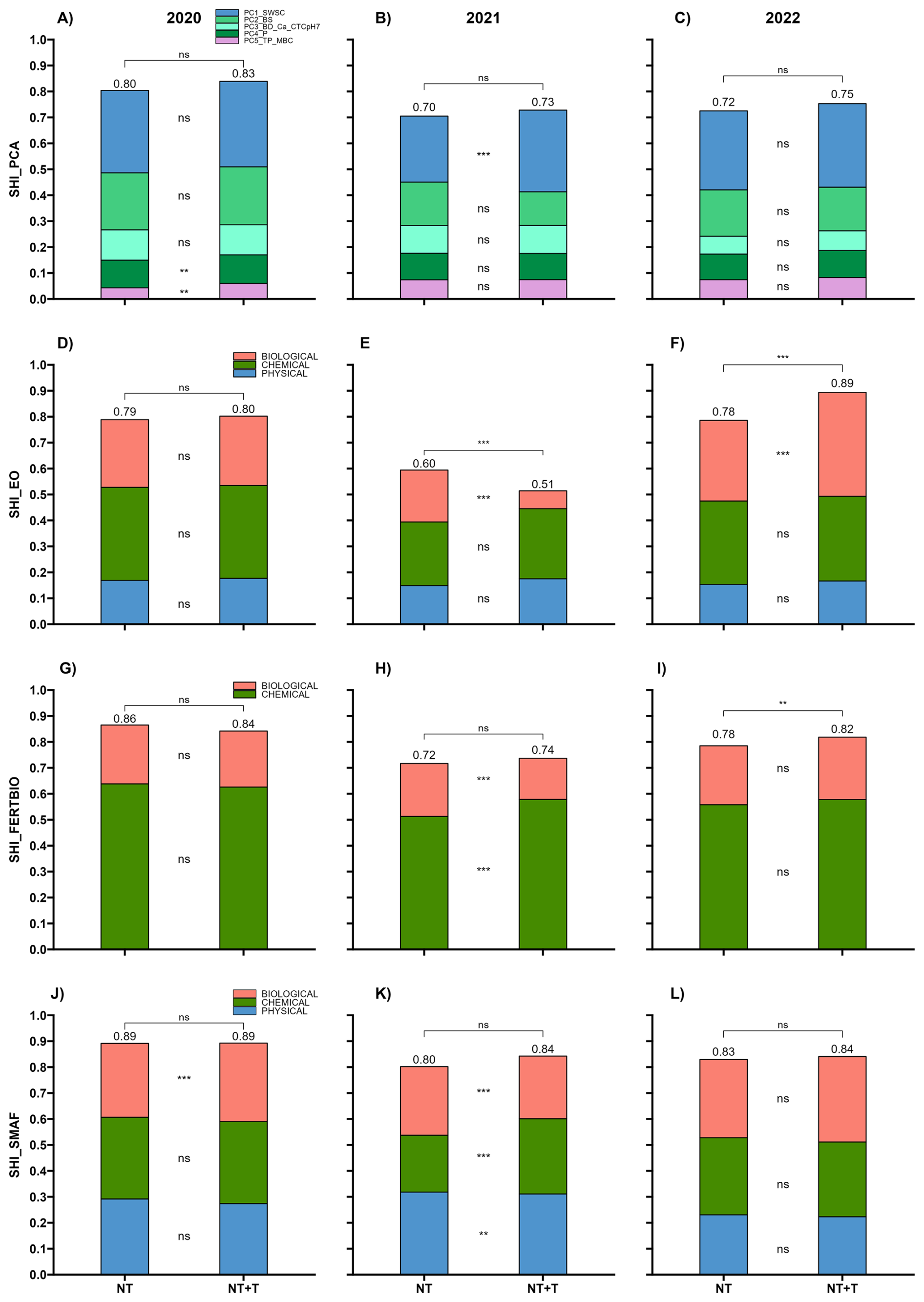 SHI_SMAF decomposition revealed differences in both 2020 and 2021. In 2020, only the biological index differed, with NT+T showing higher values. However, in 2021, significant differences were observed across all indices: NT+T had higher physical and chemical scores, but a lower biological index compared to NT. This lower biological performance in NT+T in 2021 was consistently detected by three indices – SHI_EO, SHI_FERTBIO, and SHI_SMAF. Notably, the only biological indicator common to all three indices is BG.