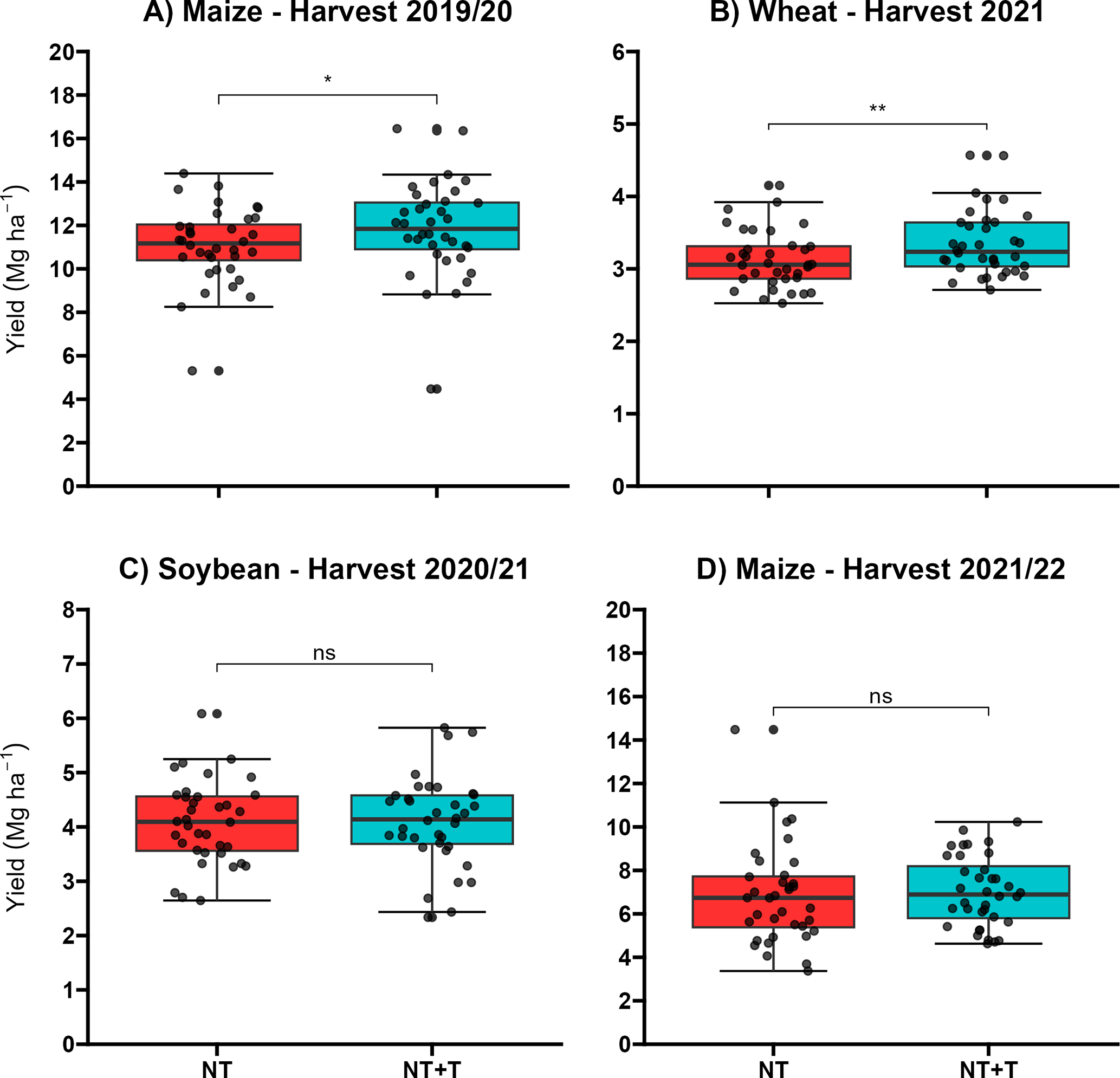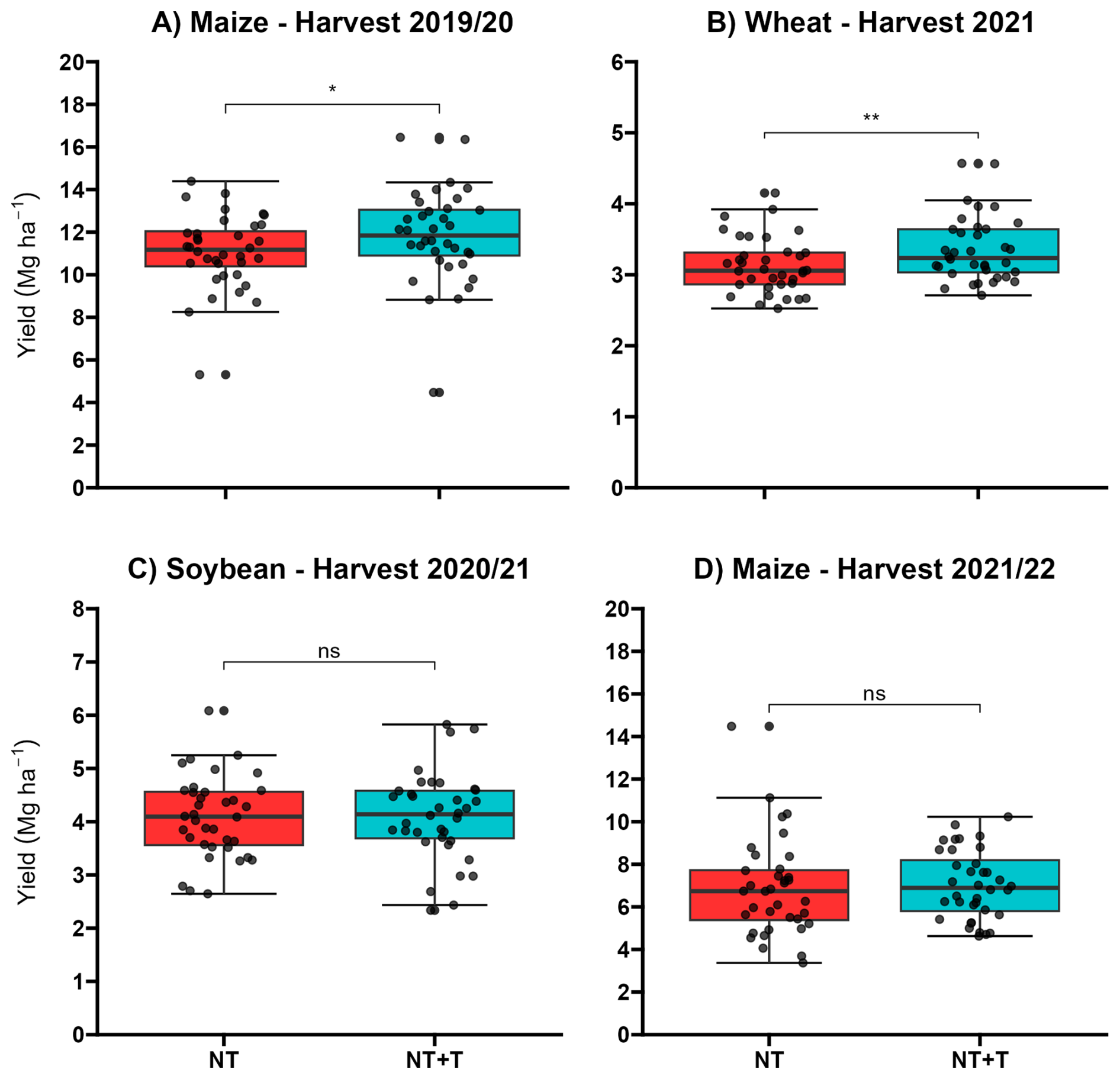 Crop yields under NT and NT+T over the years 2020, 2021, and 2022 are shown in Fig. 5. It can be observed that, in the 2019/2020 maize harvest and the 2021 wheat harvest, the NT+T treatment resulted in higher yields compared to NT. For the other harvests, no significant differences were observed between the treatments.