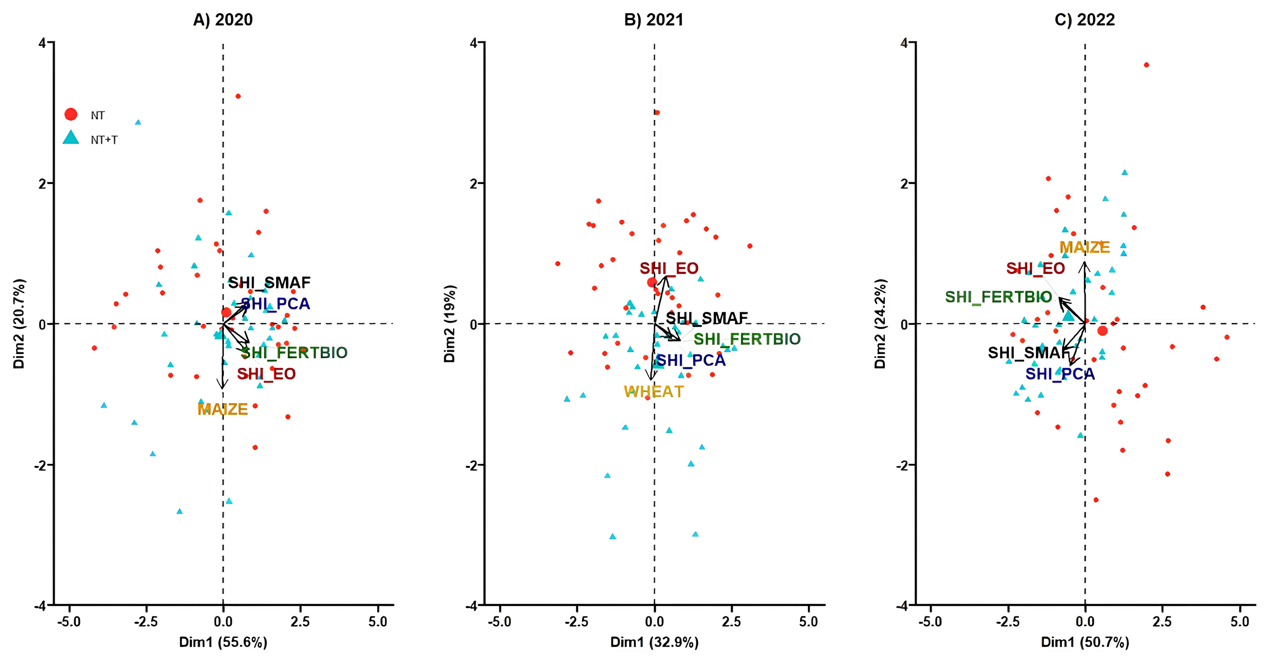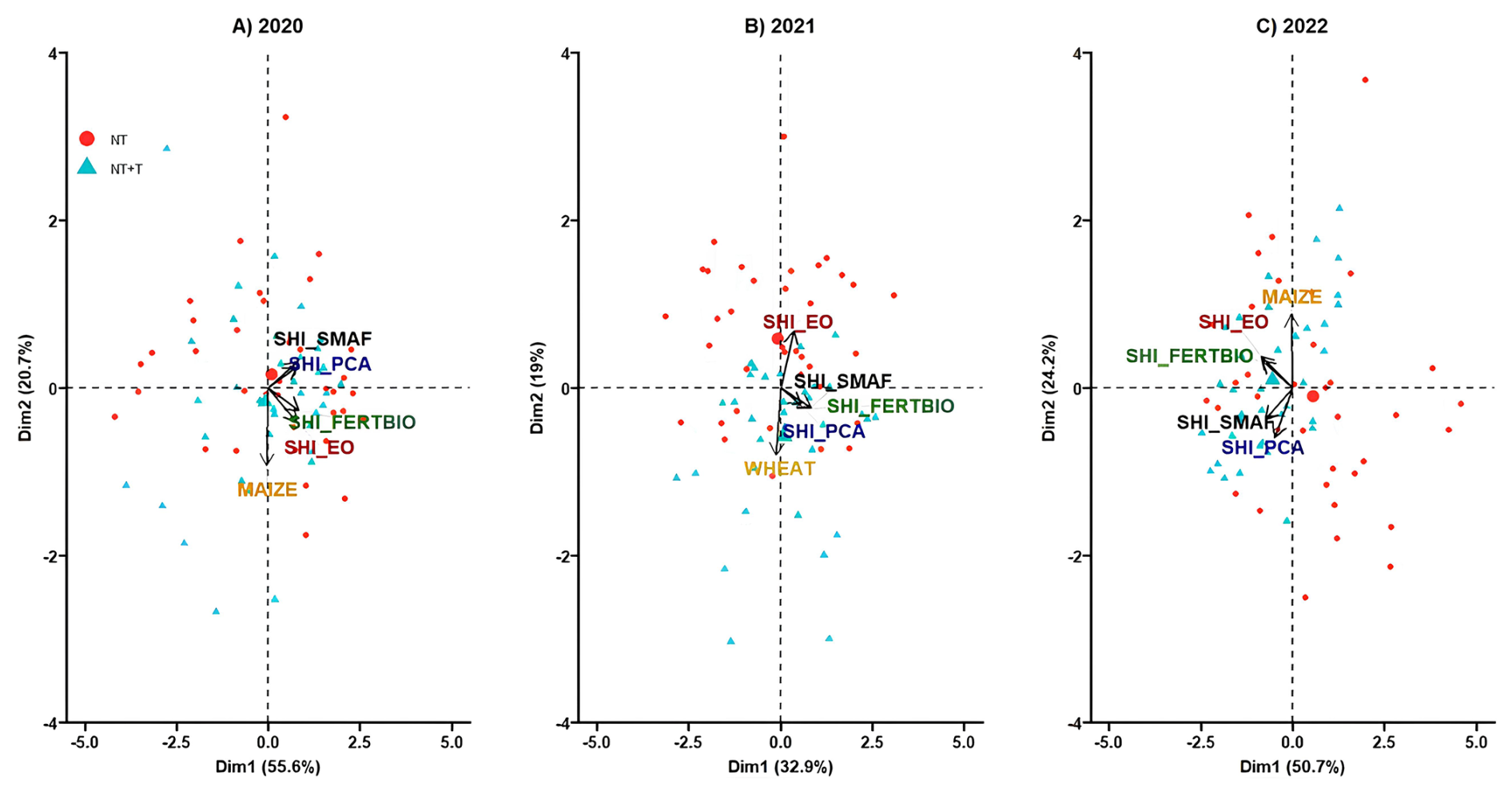 Analyzing the SHIs alongside crop productivity over the years 2020, 2021, and 2022 reveals a gradual separation between treatments along the first principal component (Dim1), with the most distinct separation observed in 2022 (Fig. 6). The SHIs show strong correlations with each other. Regarding crop performance, maize productivity in 2020 showed a weaker correlation with the indices. In 2021, wheat exhibited higher productivity under the NT+T, with a stronger association with the SHIs. In 2022, maize productivity was more closely aligned with the indices.