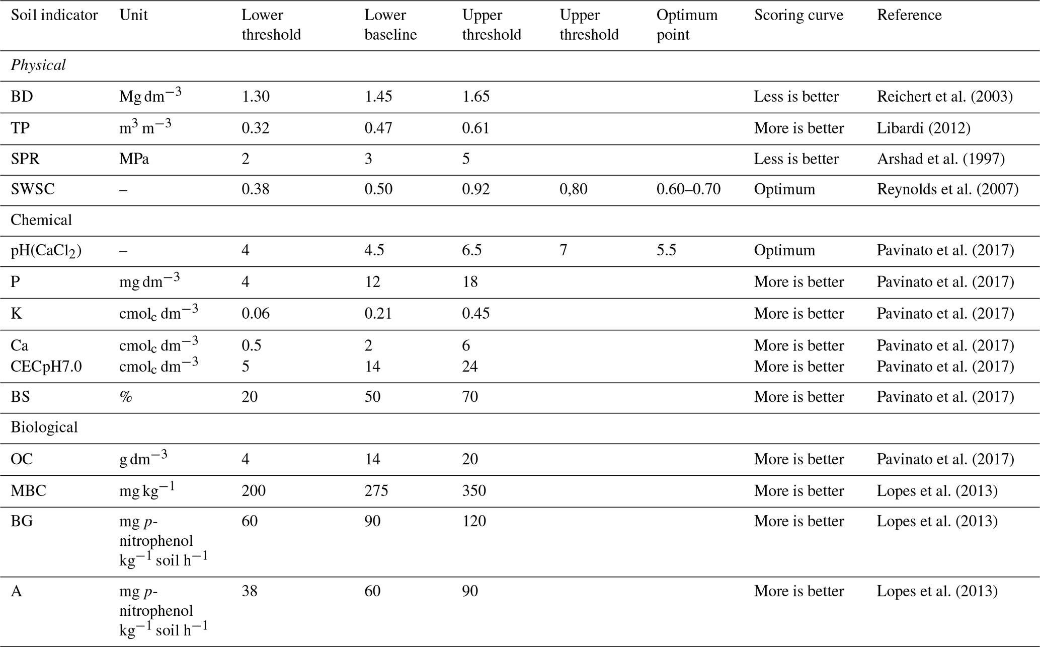 For SHI_FERTBIO, the interpretation of the indicators was also based on Karlen and Stott 1994) and on the equations of Wymore (1993). However, the calculations were performed using the Soil Quality Interpretation Module (MIQS) contained in the BioAS technology (Mendes et al., 2021b). For SHI_SMAF, the indicators were standardized according to the algorithms previously published (Andrews et al., 2004; Stott et al., 2010; Wienhold et al., 2009) (Table S2).