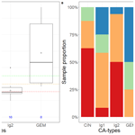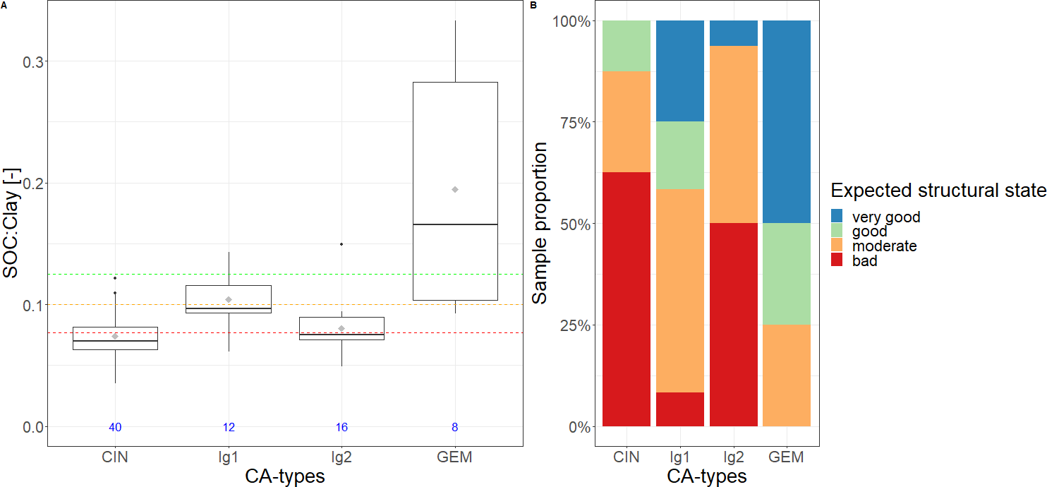 Figure 4(A) SOC : Clay ratio for each CA-type. Lines are SOC : Clay thresholds: Green = 1 : 8, orange = 1 : 10, red = 1 : 13. (B) Proportions of samples categorized by CA-type according to expected soil quality by SOC : Clay ratio, as defined by Johannes et al. (2017). Legend: Cash tillage-intensive crops non-organic farmers (CIN), temporary grassland and tillage-extensive crops with a mix of organic and non-organic farmers (GEM), intermediate group (Ig1 and Ig2).