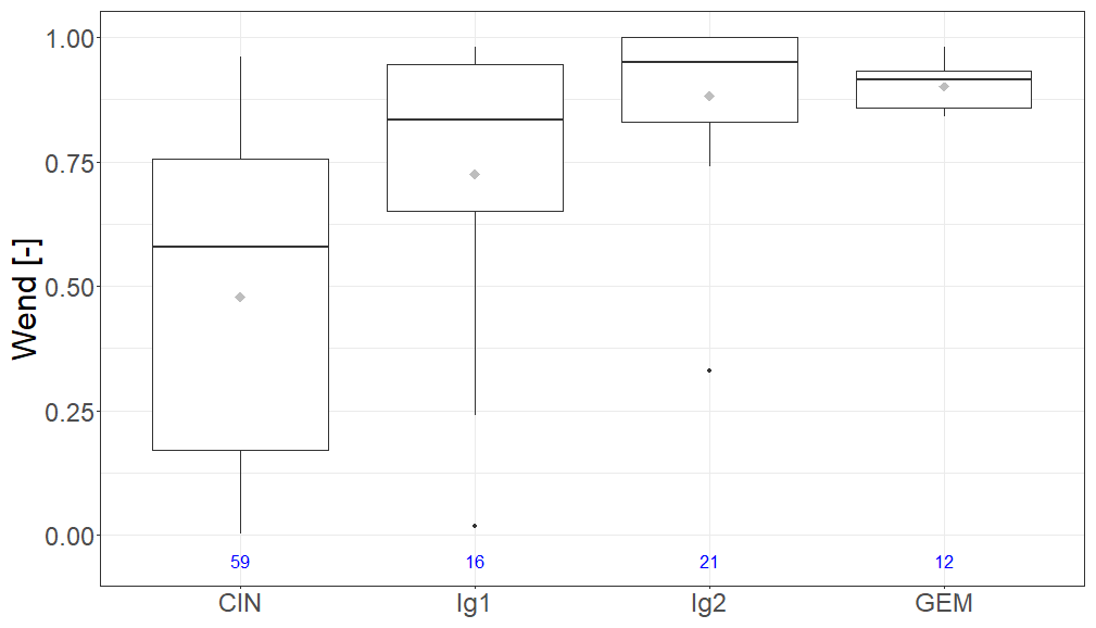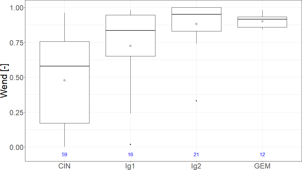 Figure 1Wend indicator calculated from QuantiSlakeTest curves for the four CA-types. Boxes show the median (thick line), average (grey diamond), and the number of individual samples per CA-type. Legend: Cash tillage-intensive crops non-organic farmers (CIN), temporary grassland and tillage-extensive crops with a mix of organic and non-organic farmers (GEM), intermediate group (Ig1 and Ig2).