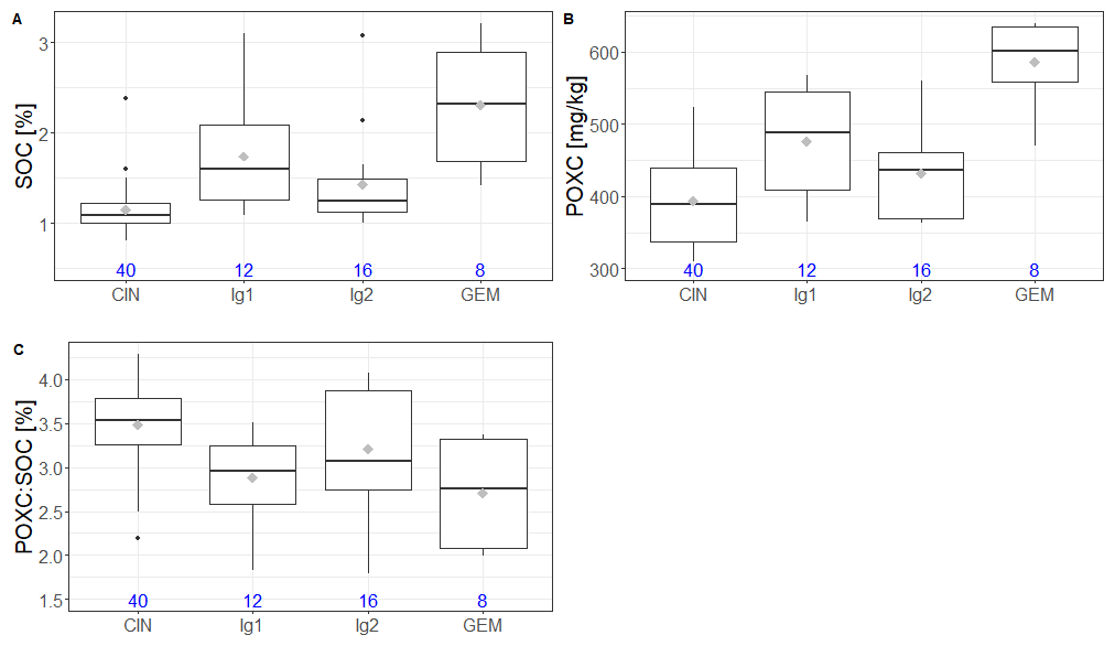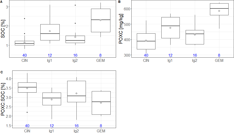 Figure 2(A) SOC contents, (B) POXC contents, and (C) POXC : SOC ratios across the four CA-types. Boxes show the median (thick line), average (grey diamond), and the number of individual samples per CA-type. Legend: Cash tillage-intensive crops non-organic farmers (CIN), temporary grassland and tillage-extensive crops with a mix of organic and non-organic farmers (GEM), intermediate group (Ig1 and Ig2).