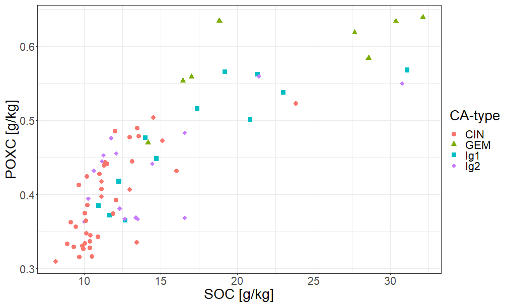 Figure 3Permanganate oxidizable carbon (POXC) as a function of soil organic content (SOC), according to the CA-types. Legend: Cash tillage-intensive crops non-organic farmers (CIN), temporary grassland and tillage-extensive crops with a mix of organic and non-organic farmers (GEM), intermediate group (Ig1 and Ig2).