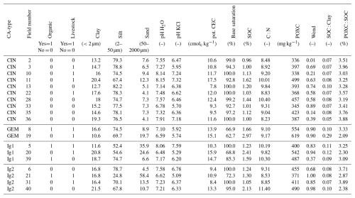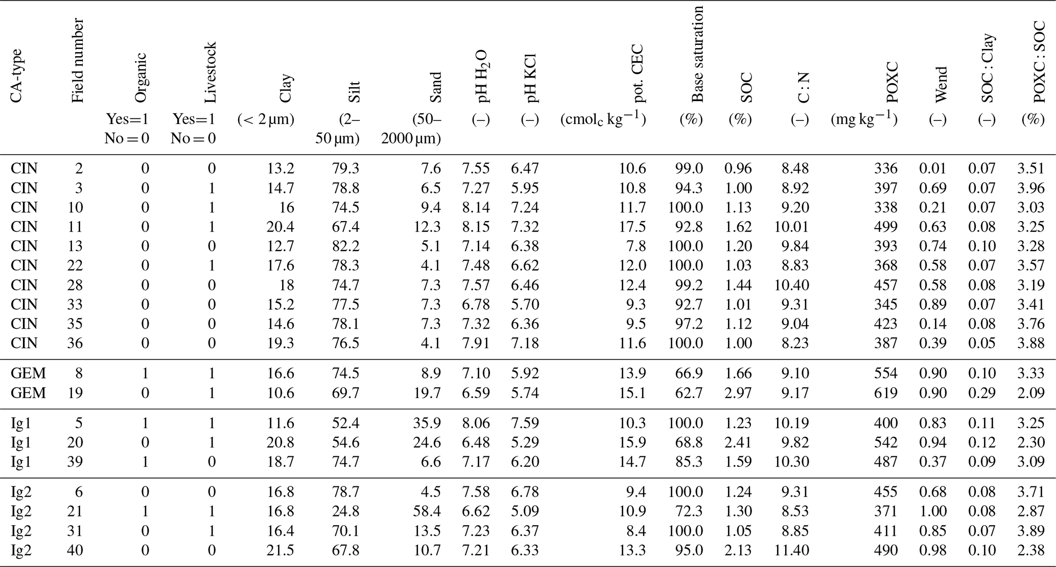 Results of soil structural stability of the four CA-types are presented on Fig. 1. CIN samples had the lowest Wend values, indicating a smaller resistance to disaggregation in water than the other CA-types. The mean Wend values increased as follows: CIN ≪ Ig1 < Ig2 ≈ GEM. For further details on soil structural stability, the QST curves are displayed for different fields according to their respective CA-type (see Sect. S5).