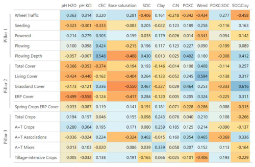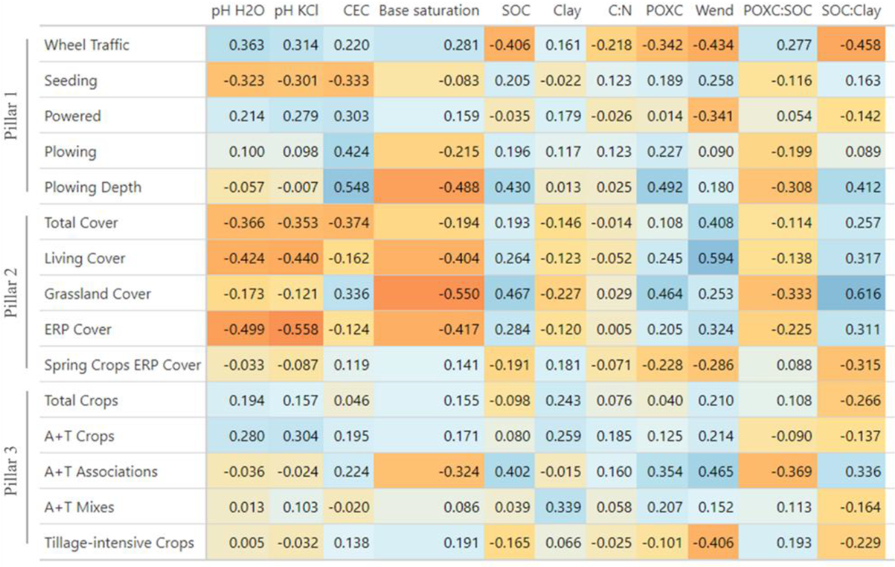 Regarding the indicators of soil disturbance, wheel traffic correlates negatively with soil structural stability (Wend; ) and the SOC : Clay ratio (), whereas plowing depth positively correlates with the SOC : Clay ratio (r=0.41). Regarding the indicators of soil cover, both total and living cover correlated positively with soil structural stability (Wend; r=0.41 and 0.59). Temporary grassland cover correlated positively with the SOC : Clay ratio (r=0.62) but negatively with the POXC : SOC ratio (). Regarding crop diversification, crop association correlated positively with soil structural stability (Wend; r=0.47), in contrast to the occurrence of tillage-intensive crops that correlated negatively with soil structural stability (Wend; ).